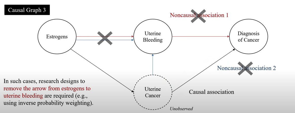 - 연구 디자인으로 Estrogen → Uterine Bleeding의 연결고리를 끊으면 noncausal associaton2가 끊김