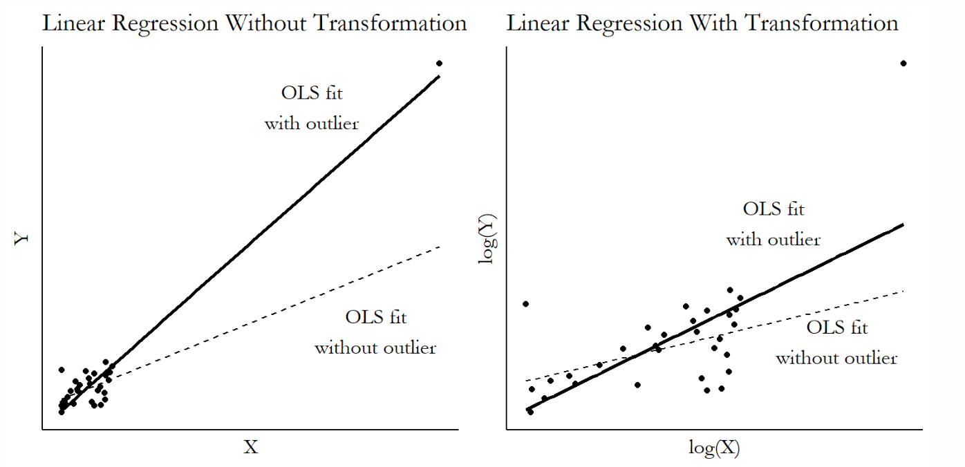 - 이 때, 우측 그래프에서 OLS fit w/ outlier의 기울기와 OLS fit \wo outlier의 기울기에 차이가 있는 것은 괜찮음 - 오기입된 데이터가 아니라면, 모든 데이터가 회귀선에 영향을 미쳐야 함