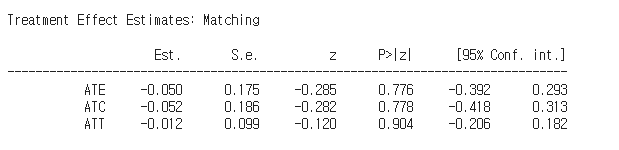 - 3가지 변수로 propensity score를 생성, mahalanobis 거리를 기반으로 1:1 매칭을 수행하여 ATE, ATC, ATT를 분석함