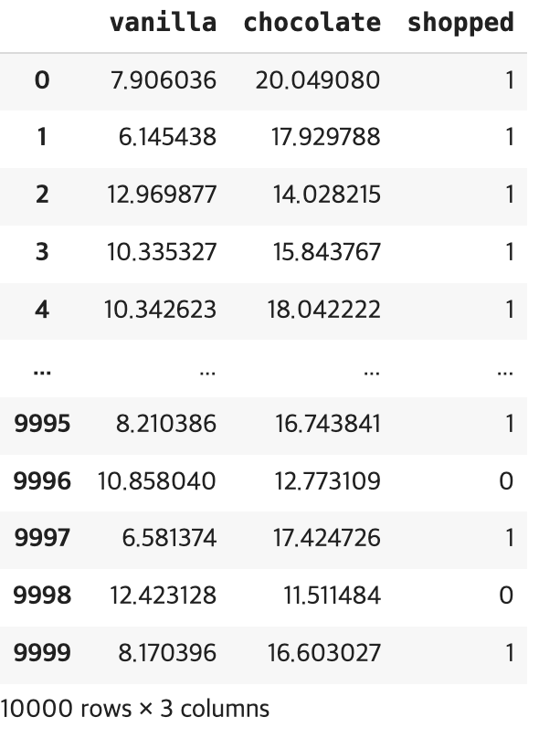 - 컬럼 순서대로 바닐라맛 선호도, 초콜릿맛 선호도, 매장에서 구매 이력이 있는지 여부