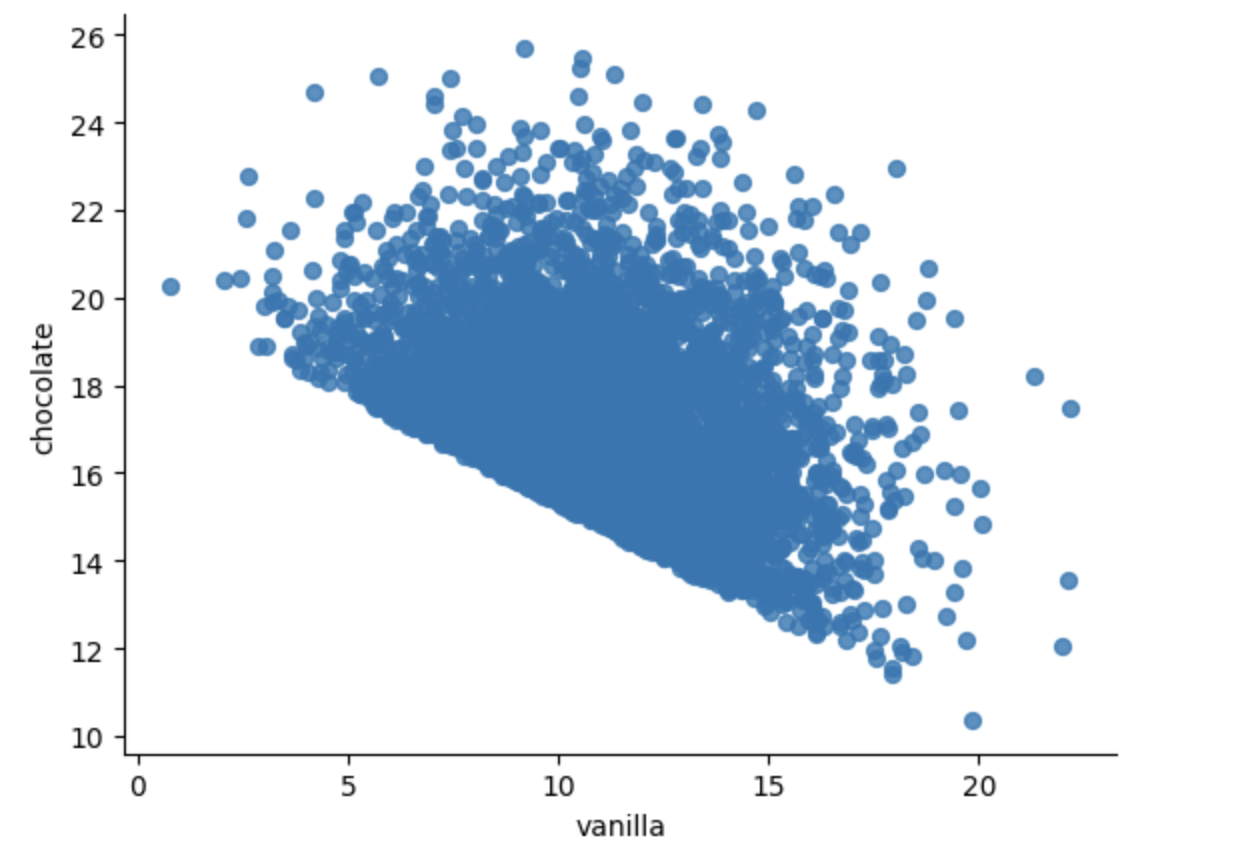 - 전체 데이터를 가지고 바닐라맛과 초콜릿 맛 간 scatter plot을 그린 경우