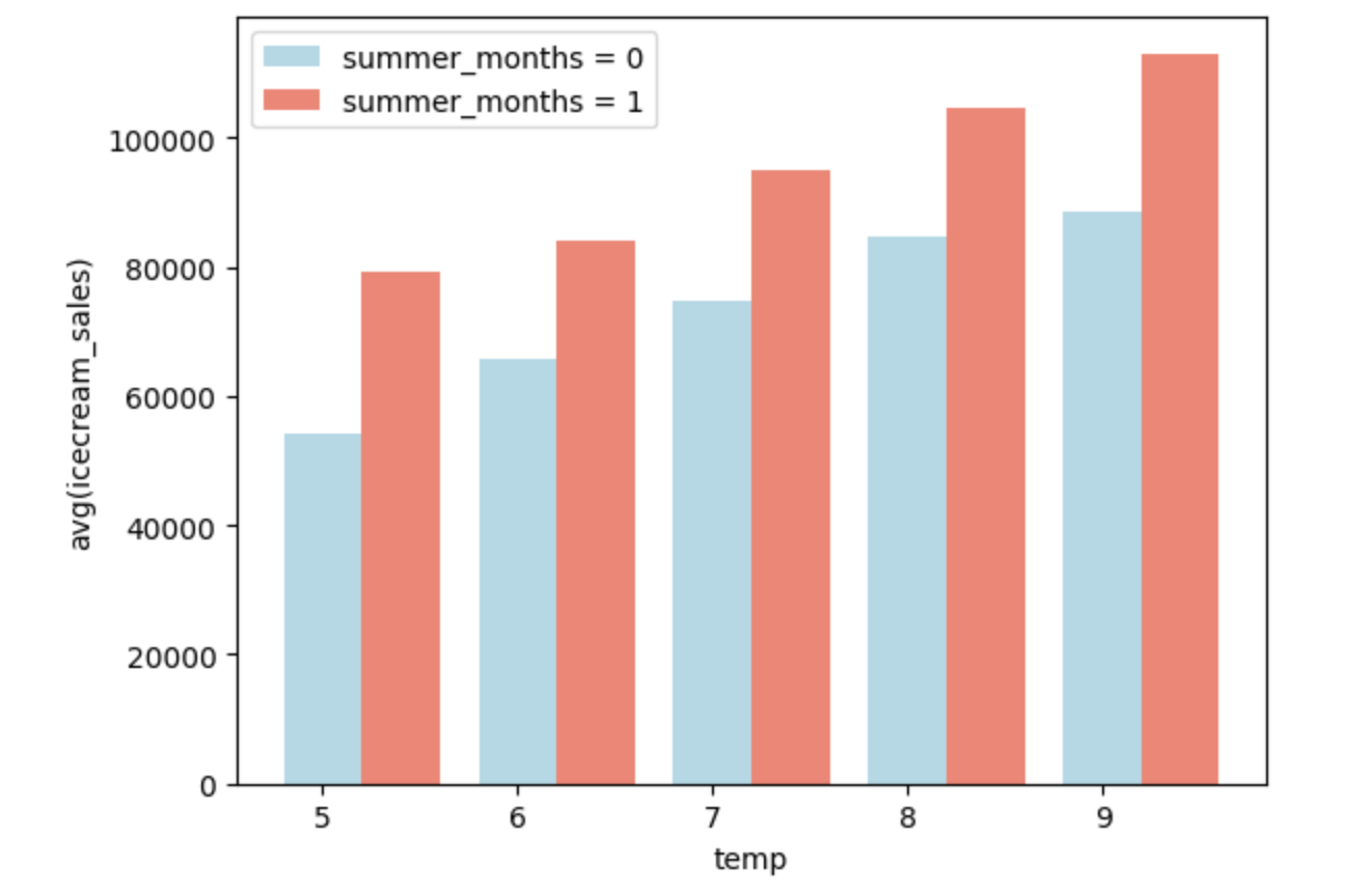 - -> 동일한 온도일 때, summer_months = 1일 때가 0일 때에 비해 아이스크림 판매량이 높다. 온도가 똑같이 높더라도 여름철에는 방학이 있어서 아이스크림을 더 많이 사먹는다는 가정이 있음. 즉, 여름 여부가 교란 변수이다!