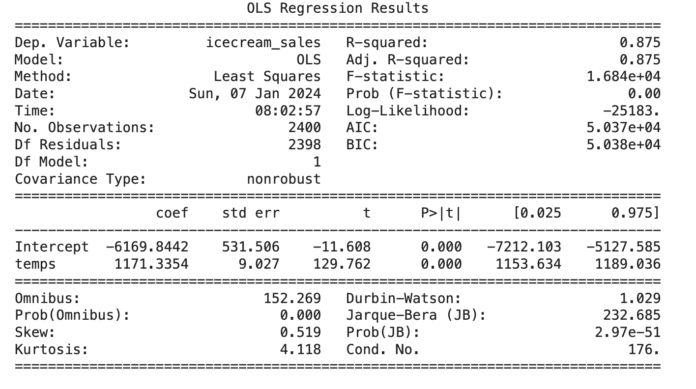 print(ols("icecream_sales ~ temps", data = stand_data).fit().summary())