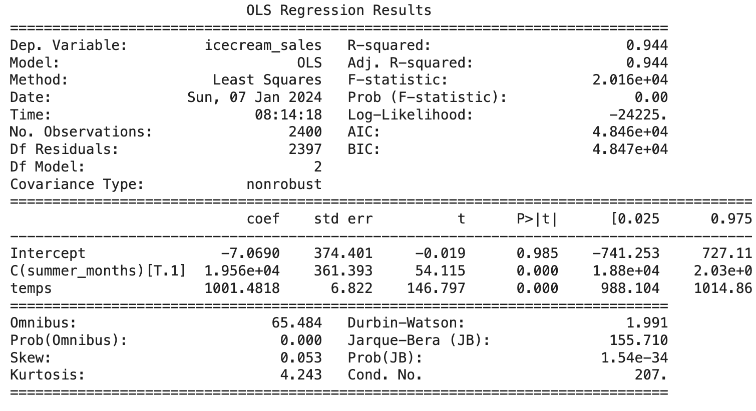 - 여름 여부가 아이스크림 판매량에 미치는 영향이 매우 큼 (coefficient가 19560으로 매우 큰 편)