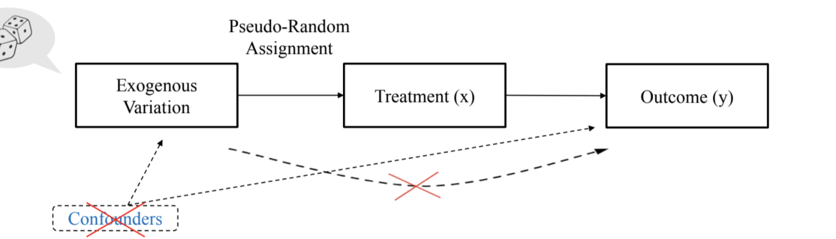 주사위 던지기같은 Exogeneous Variation으로 Treatment group과 Control group을 랜덤하게 나눔으로서 Research Design을 실현할 수 있음. 다만, Exogeneous Variation이 Outcome에 영향을 주거나 다른 Confounder가 방해하면 안됨. Outcome의 효과가 오로지 Treatment에 의한 것임을 분명히 해야 함