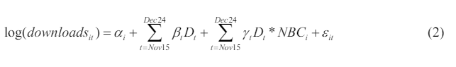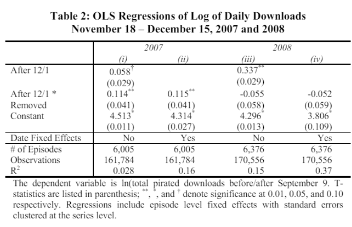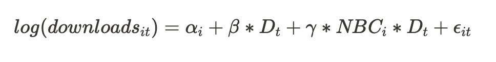 - NBC 컨텐츠를 Treatment group으로, non-NBC (ABC, CBS, Fox 등 ITunes에서 컨텐츠를 계속 제공하는 네트워크) 컨텐츠를 Control group으로 하여 불법 채널과 합법 채널에서의 컨텐츠 수요 수준의 effect 차이를 DID으로 분석함