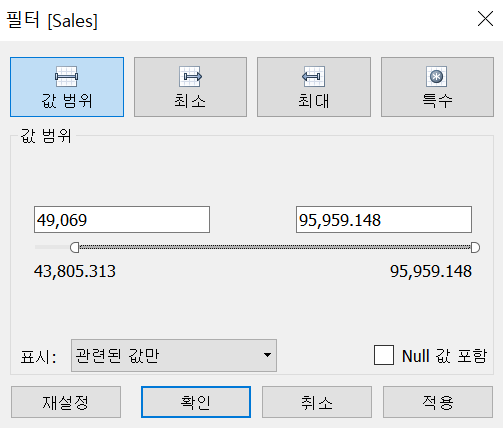 사진처럼 최소값을 높이면, region 별 sales 합계가 가장 낮은 region이 필터 아웃 된다.