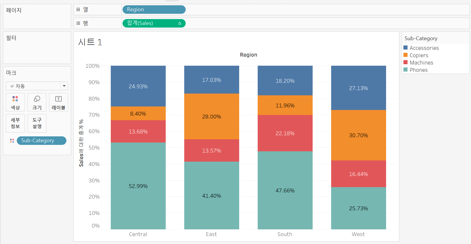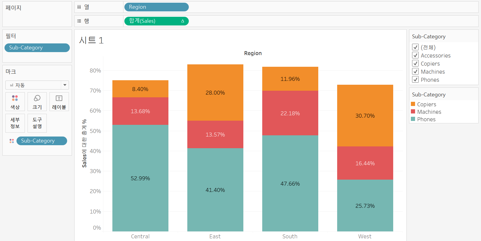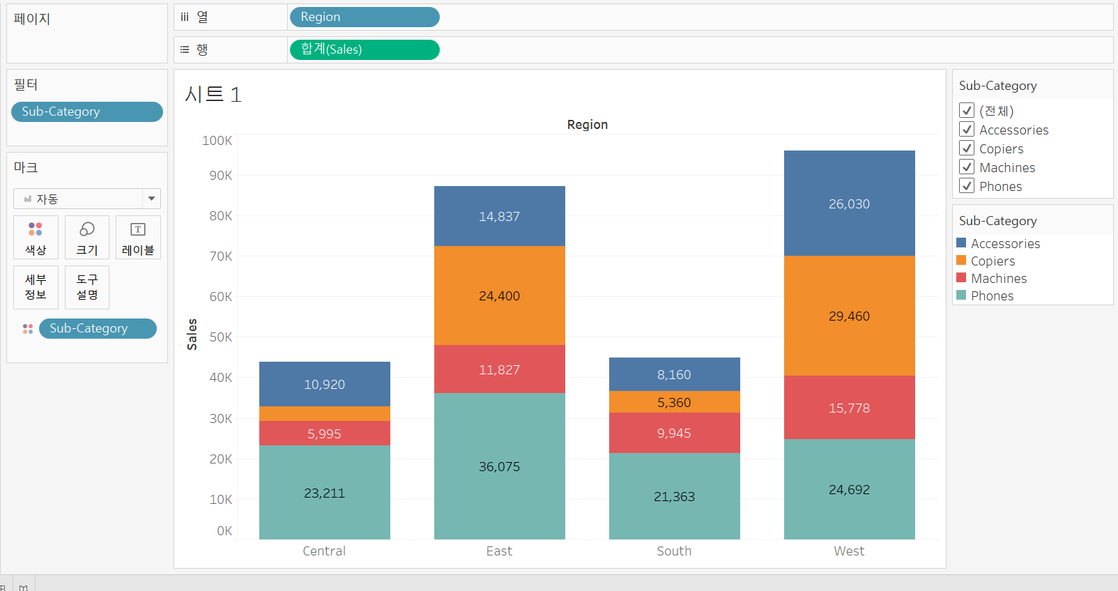 sub category를 마크>색상에 올리면 region 별 sales가 subcategory에 따라 색깔이 다르게 표시된다.