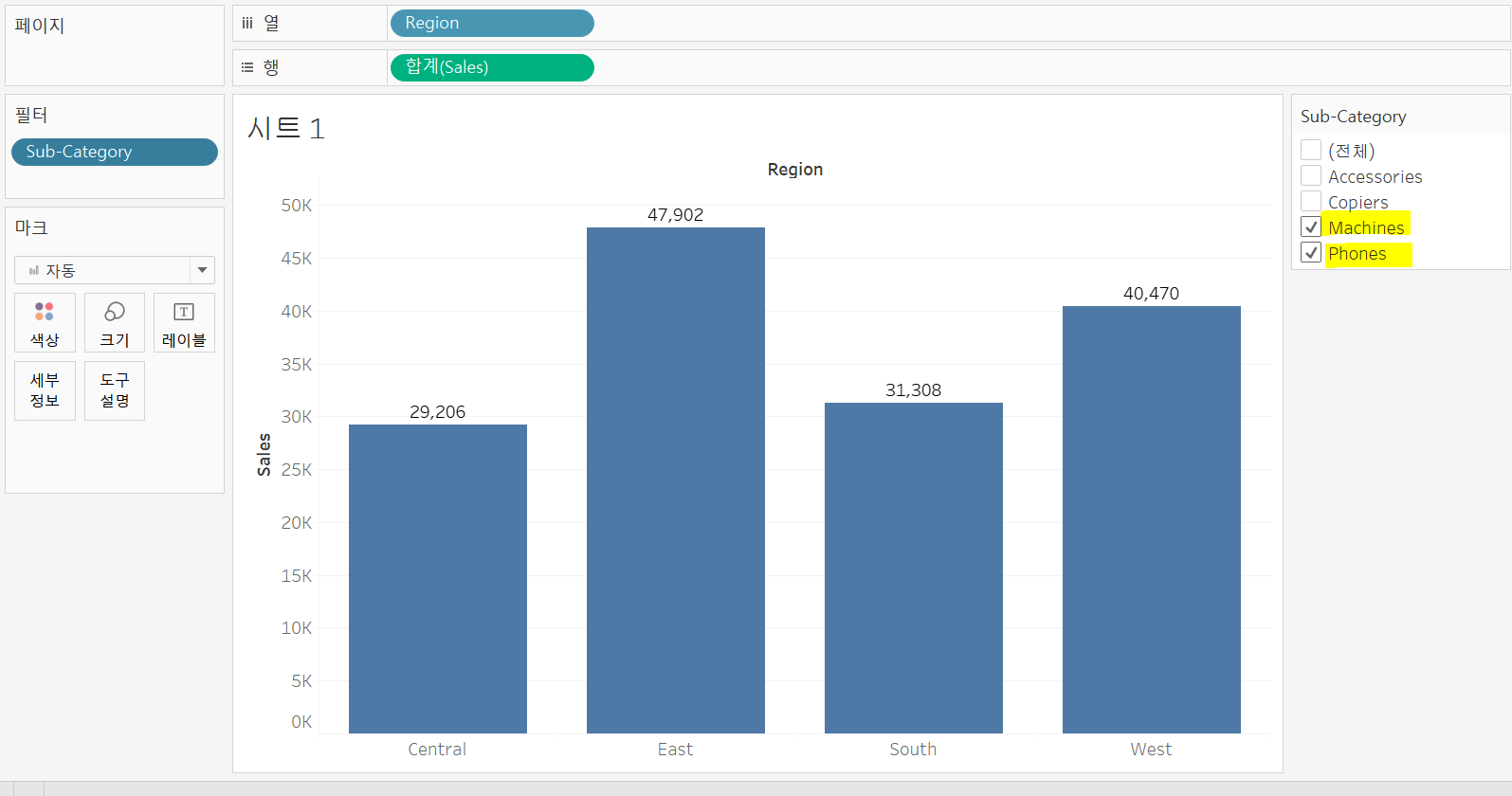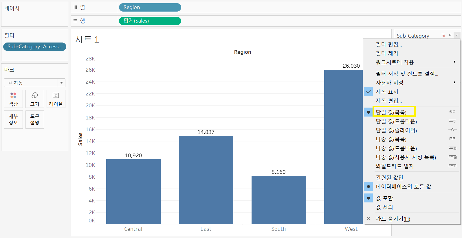 필터 필드에서 '모든 값'을 선택했더니, 이번엔 region 별로 집계된 sales 값이 아닌, 집계되지 않은 raw 레벨 하에서의 sales 값을 대상으로 데이터를 필터링 할 수 있다. 이렇게 필터링 하면 전체 지역에서 전반적으로 필터 아웃 시킬 수 있다.