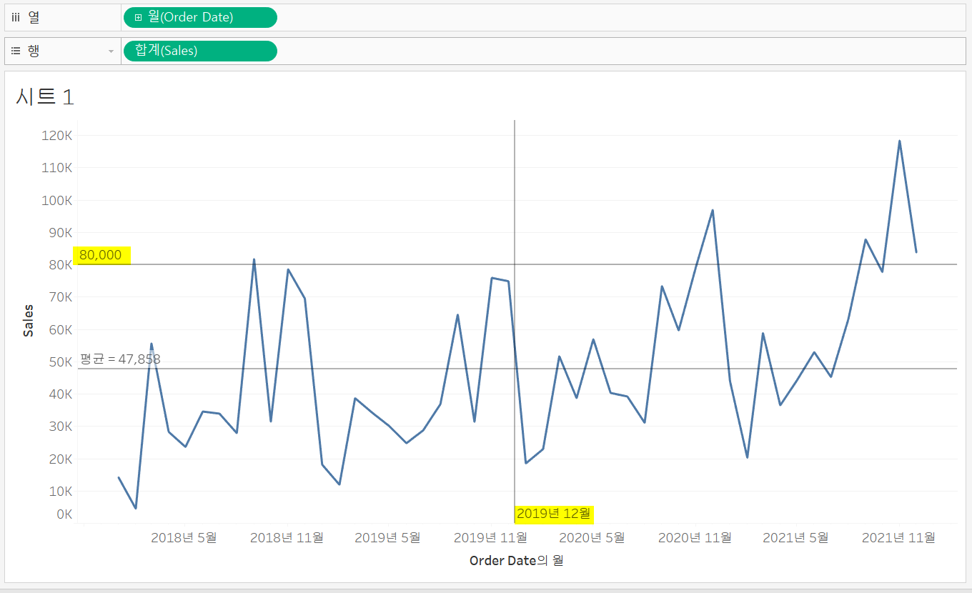 sales에 80000으로 추가해서 가로선이 그어졌고, order date에 2019년 12월으로 추가해서 세로선이 그어졌다.