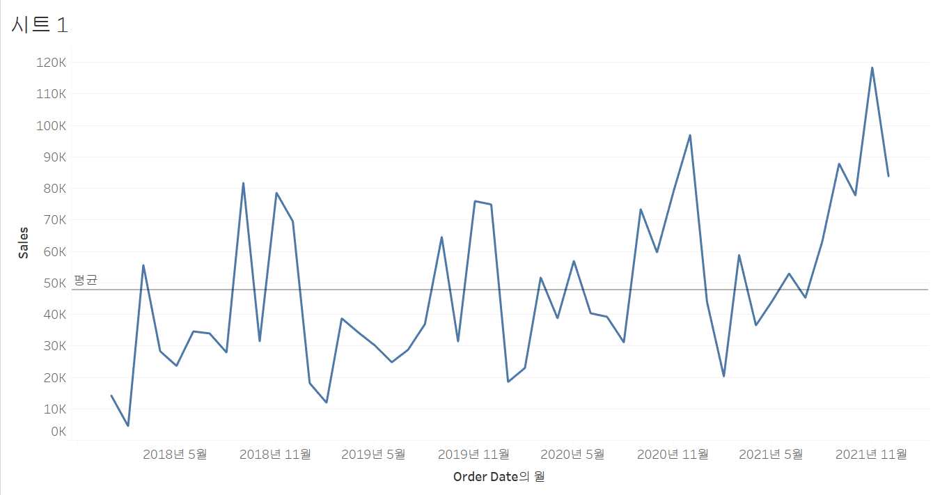 열선반에 order date의 연속형 월을, 행선반에 sales를 둬서 라인 차트를 만들고 분석 탭에서 평균 라인을 추가했다.