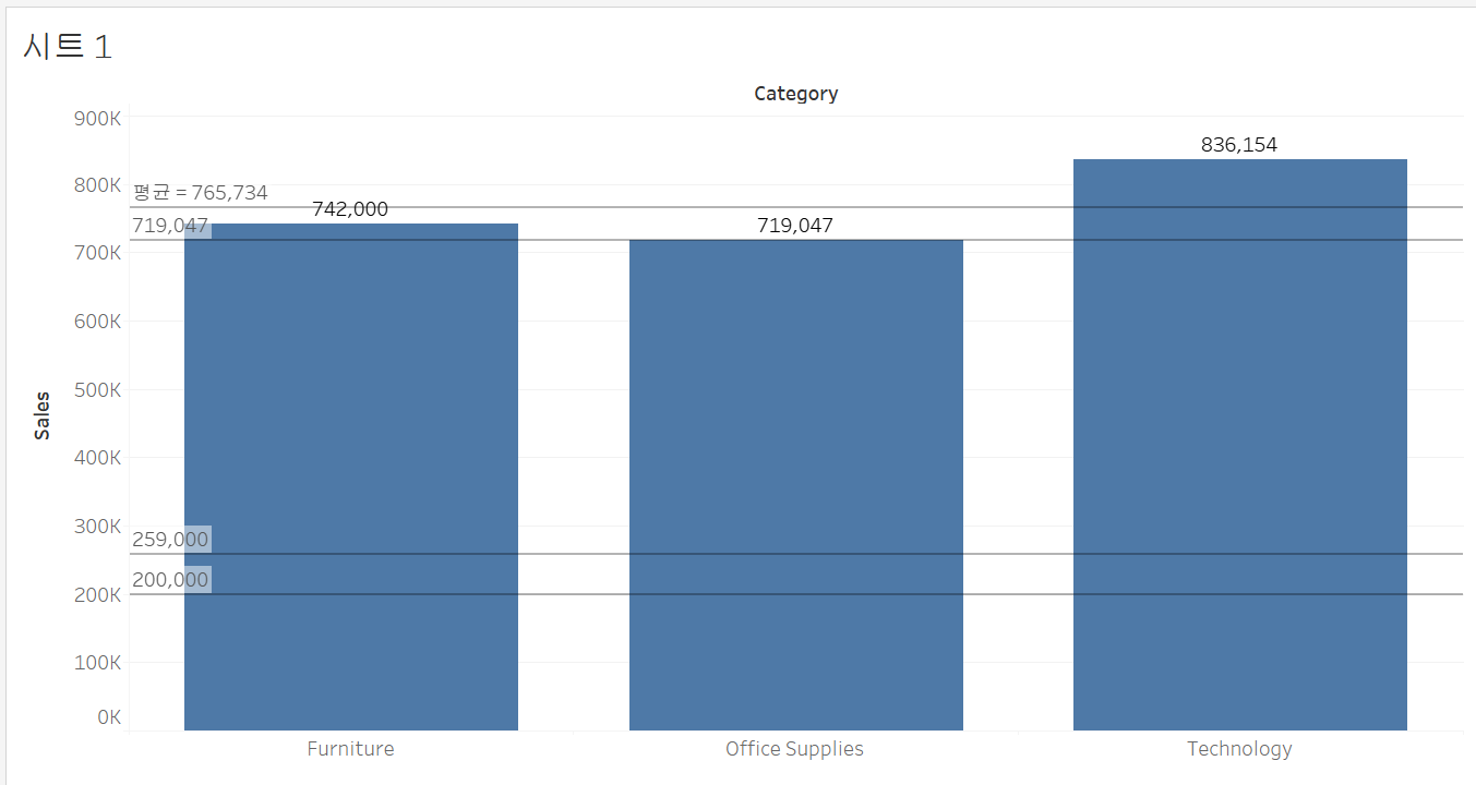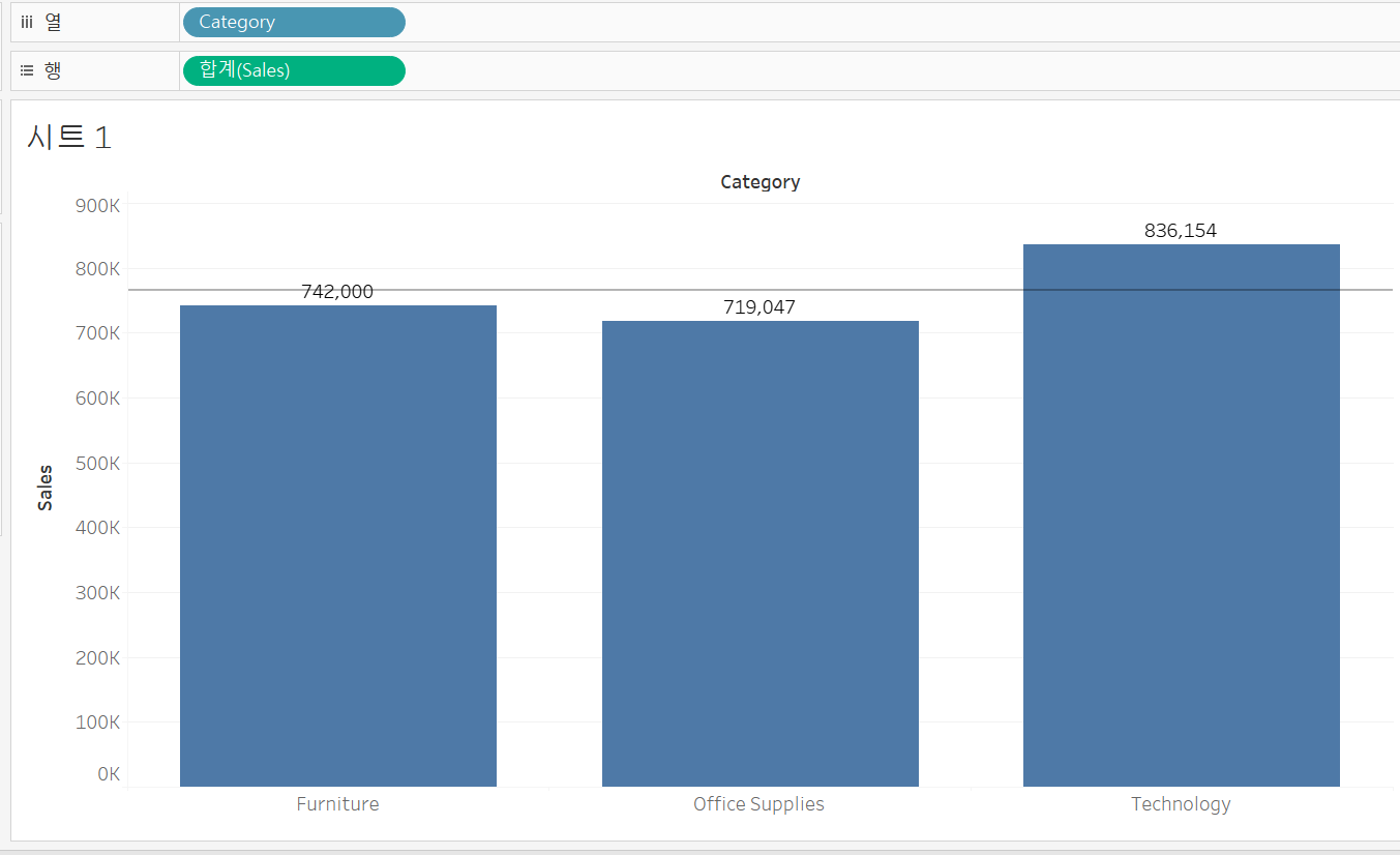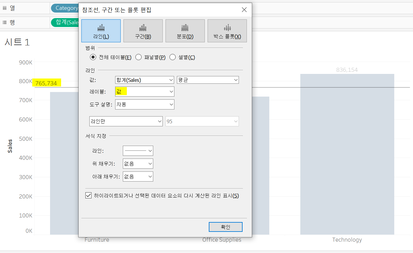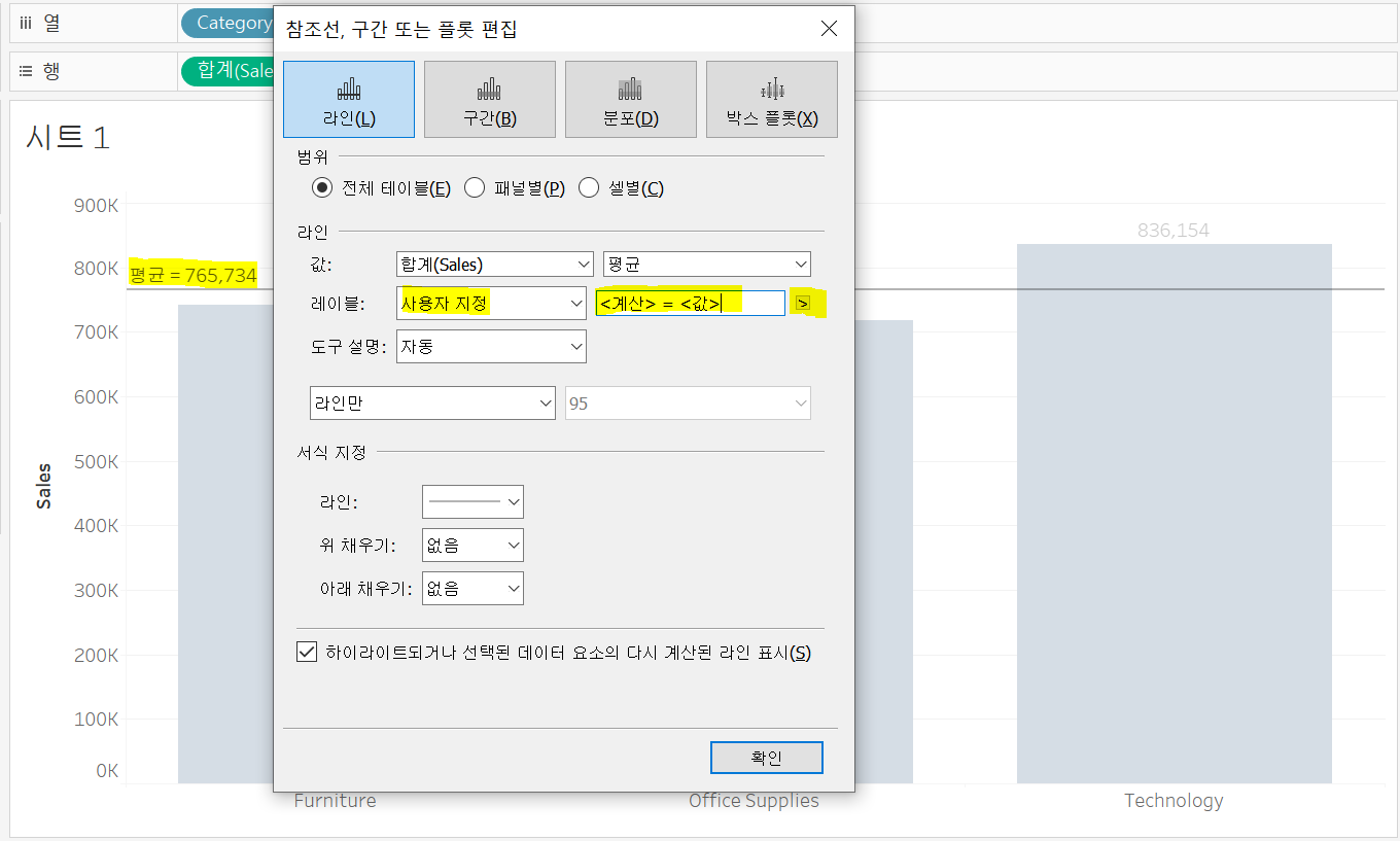 카테고리 별 sales를 알기 위해 선반에 올려놓고 분석 탭에서 상수라인을 시트 안에 끌고 오면 상수를 설정할 수 있고 그 상수가 시트 안에서 선으로 표시된다.