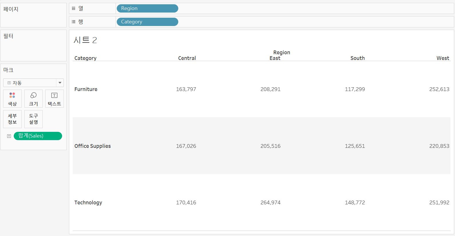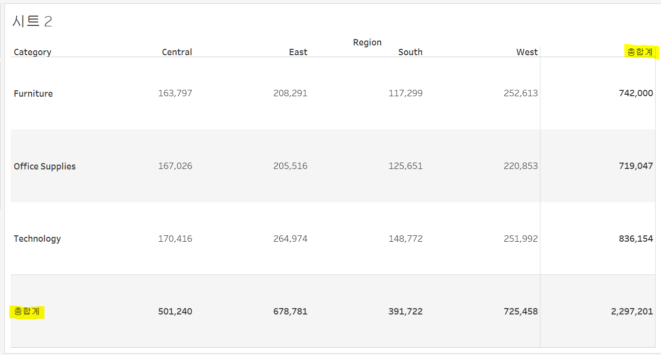 '총계'는 차트보다는 테이블에서 많이 쓴다. region과 category 별 sales의 합계를 확인하기 위한 테이블을 만들었다.