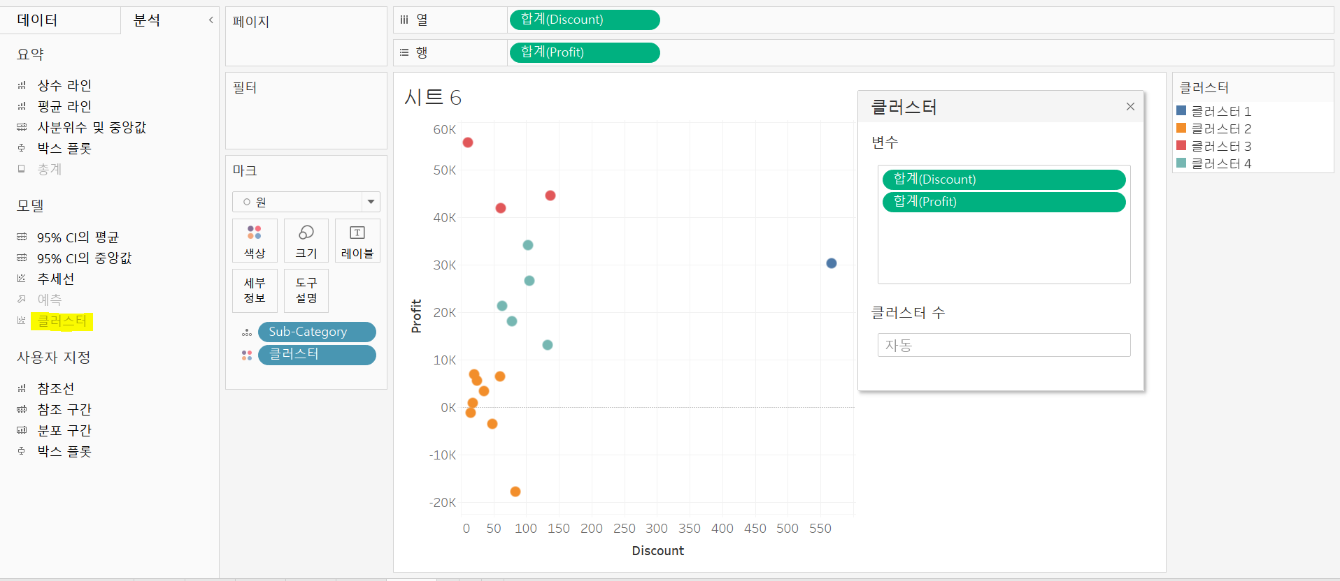 분석>클러스터로 분포를 가까운 점들을 기준으로 그루핑 할 수 있다. K-means clustering의 알고리즘을 사용했다. 마크카드의 클러스터 우클릭>클러스터 편집에 들어가면 어떤 변수가 클러스터링에 사용되었는지 확인할 수 있고 클러스터 수도 결정할 수 있다. 여기선 데이터가 4개의 클러스터로 구분되었다.