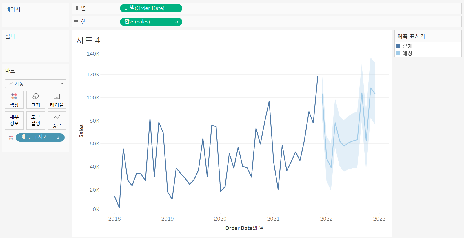 예측 기능은 불연속형 날짜 필드에 대해서도 사용할 수 있다. 열 선반에 연속형 월을 넣어주고 분석>예측을 해줘서 불연속적 order date에 대해서도 sales를 예측할 수 있다.